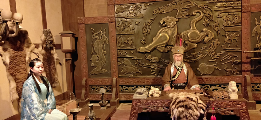 之后我們返回當(dāng)陽頭碼頭登船前往燈影閣碼頭,乘坐扶梯去往巴王寨。巴王寨是用石頭、原木和泥土作為原材料建筑而成,記錄并呈現(xiàn)了一個民族從興盛到衰弱的歷史過程,沿路看到磨石、雕刻等具有農(nóng)耕風(fēng)情的巴人生活,古色古香。然而老天下起了雨,大家狼狽前行,錯過了燈影石的好風(fēng)光。不過有兩位穿著巴人服飾的大叔在雨中駐守于巴王宮外,繼續(xù)扮演他們的“角色”,相當(dāng)敬業(yè)。巴王宮內(nèi)刀槍劍戟擺在中堂兩側(cè),一股肅殺之氣沖天而起,巴王端坐在殿中,旁邊是巴王女兒。雖然這是人造的仿古景點(diǎn),但似乎有那么點(diǎn)意思。聽另一位導(dǎo)游說,如果不下雨的話,每天都會有古巴人風(fēng)情的仿古舞蹈表演,很好看,不禁感到遺憾。不過我們還聽了蘭曲,看了十分鐘的女書小劇場,各有特色。