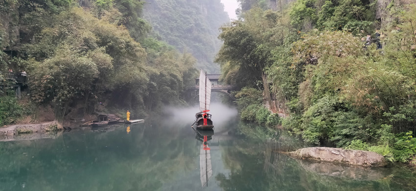 下船第一站-當(dāng)陽頭碼頭,這里是游客中心,有很多餐館,我們跟隨導(dǎo)游吃過飯后便前往第一個景點(diǎn)-水上人家。穿過售貨長廊,便看到了龍進(jìn)溪:正對溪口的江北山崖上,一條帶狀石嶺從山頂蜿蜒而下,快臨江時向上高高翹起如一條巨龍,龍頭所向,像要跳進(jìn)南岸的清溪內(nèi),龍進(jìn)溪因此而得名。岸邊幾只古帆船迎風(fēng)而立,纖夫們在叫喊著,頗為熱鬧。這里溪水清綠,林木蒼翠,不遠(yuǎn)處還有土家族打扮的紅衣姑娘撐著紅傘站在船頭,后面還有人工制造的仙氣圍繞,真的是“龍溪橋下春波綠,驚鴻拂面照影來”。