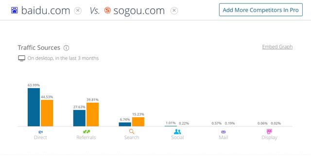 這組數據告訴我們各自流量來源的渠道和方式,63%的訪客通過直接輸入網址訪問百度,搜狗是44.53%,說明百度的網址更便于記憶,以及有疑問的時候大多數人先想到的是百度。而檢索這塊,7.74%的人會搜索“百度”來找百度的網站,而15.23%的人會搜索“搜狗”去找搜狗網站,這一點更是說明了兩者網址便于記憶的程度。