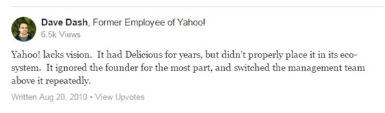 雅虎的一些高管表示,梅耶爾并未好好運用在谷歌學到的數據驅動方法來做決斷。她在聘用一些管理人員時沒有嚴格審核,而這些決定讓公司付出了高昂代價。雅虎前員工也對雅虎做出評價:雅虎缺少遠見。他很大程度上忽視創(chuàng)始人,并且過于頻繁的更換領導層。