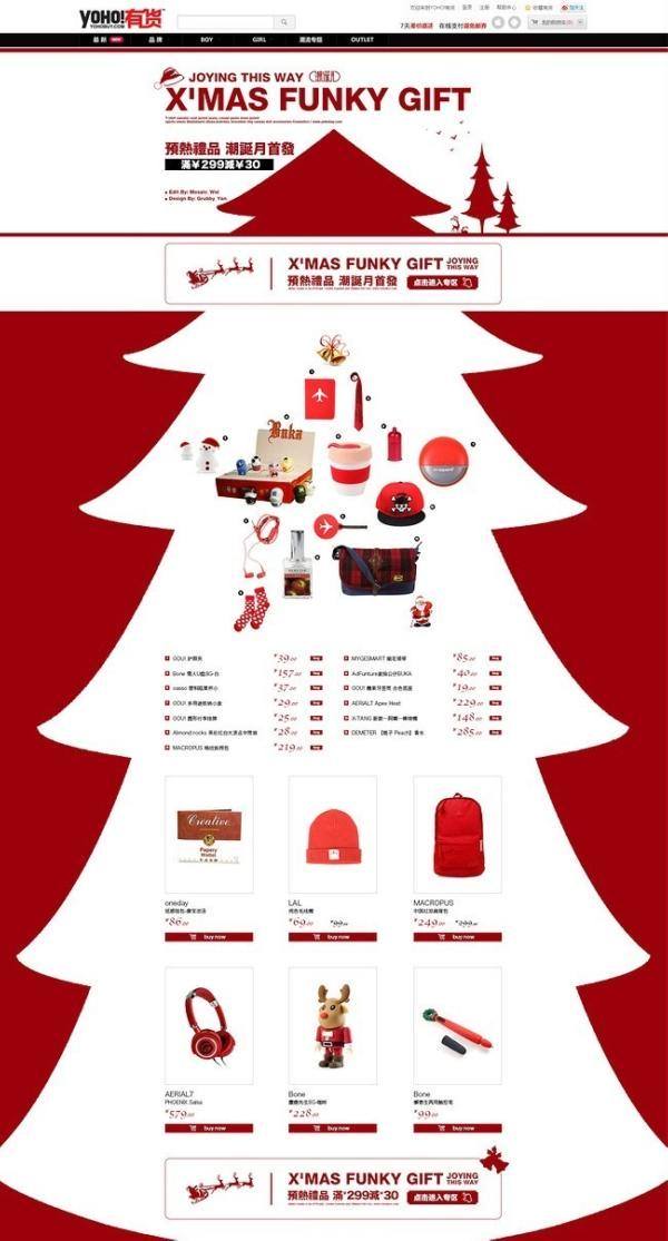 通常圣誕節的元素無非也就是那幾種:大大的禮盒、大大的圣誕樹、大大的圣誕老人、大大的長筒襪、大大的房子、大大的裙子,總之,界面的設計訣竅在于要有很大的一個元素撐得起整個畫面。